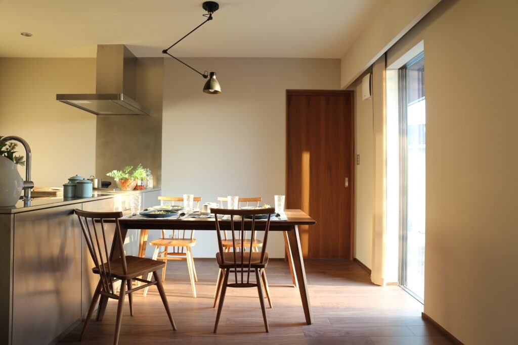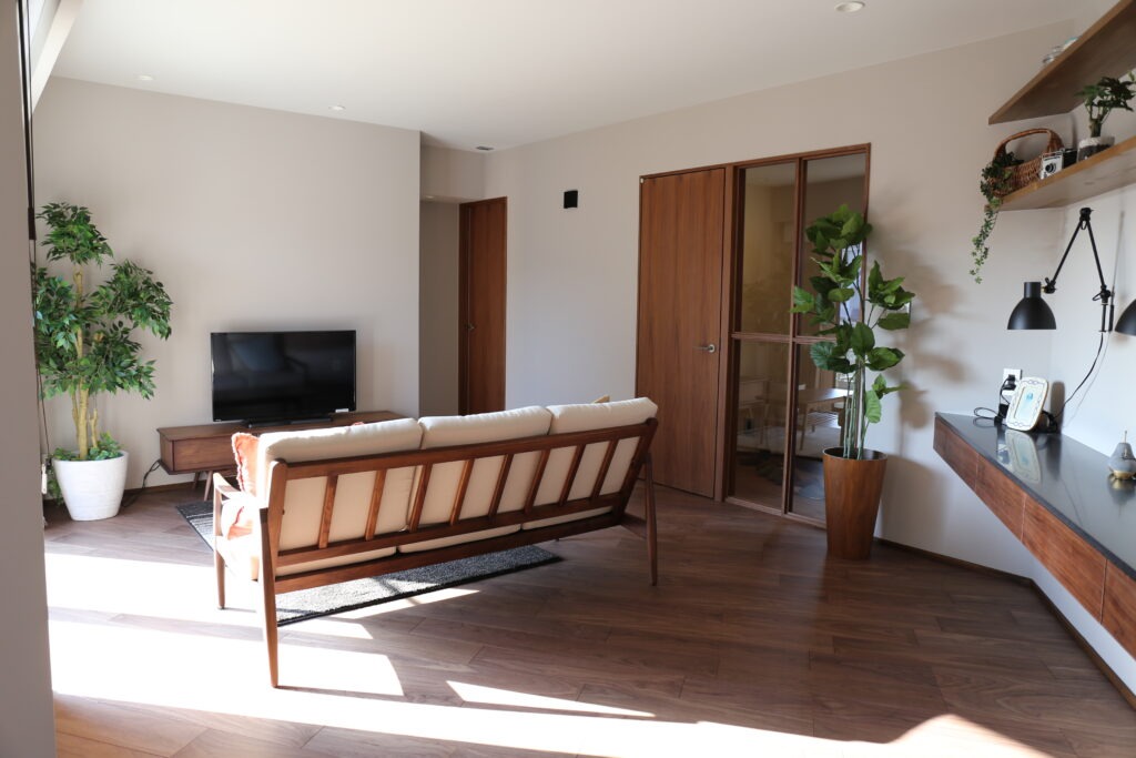 こちらの事例では、室内ドアをはじめ、フローリングや家具の一部にウォルナットが使われています。自然光がウォルナットの室内ドアをやわらかく照らし出し、木のぬくもりと上質さの絶妙なバランスが魅力です。