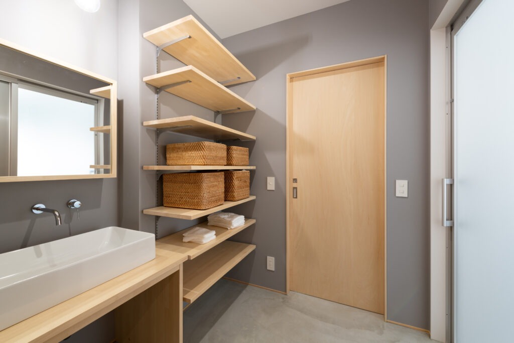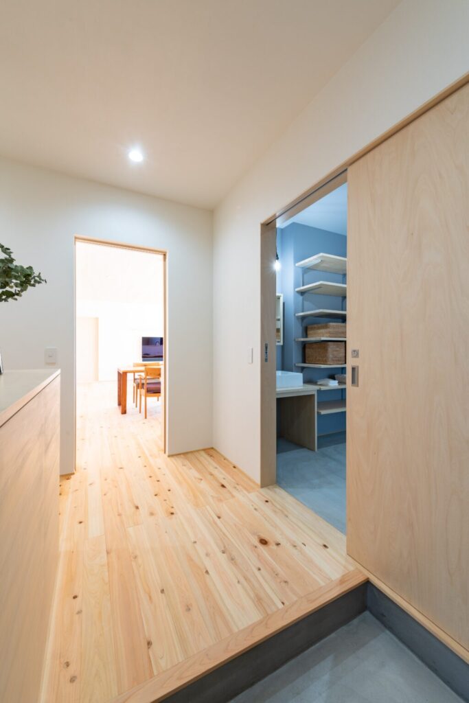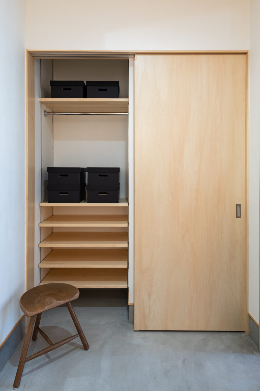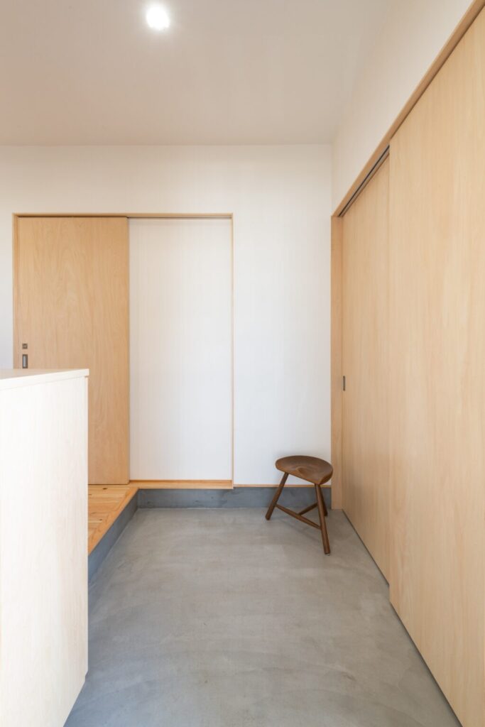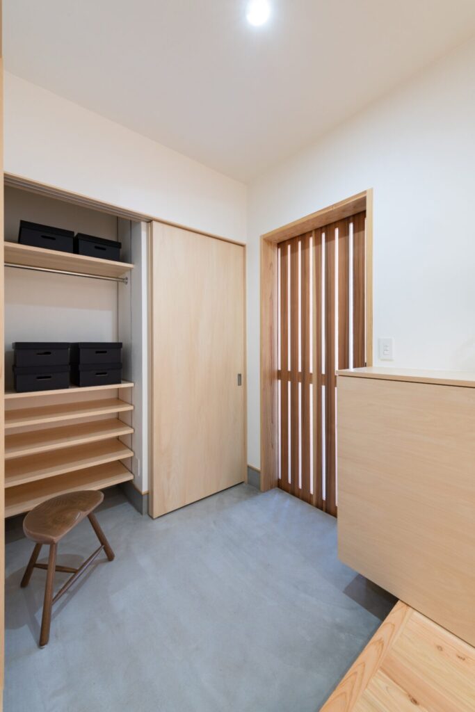 モルタルを使った土間は掃除がしやすく、機能性に優れる一方で、「どこか冷たく感じられる」という印象を受けることもあります。この事例では、モルタルの土間にシナ材の片引き戸を組み合わせ、さらに木材を用いた収納にすることで無機素材の印象を和らげています。異なる2つの素材を組み合わせることで、モルタルの機能性とシナ材のぬくもりが共存する、洗練された空間が実現しました。