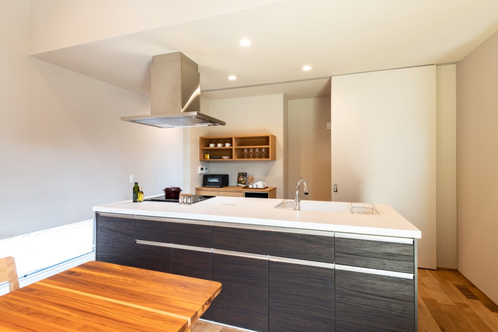 こちらの事例では、キッチン背面の引き違い戸をホワイトで塗りつぶしました。閉めたときに壁と一体化して見えるように、天井までの高さがあるハイドアタイプを採用しています。