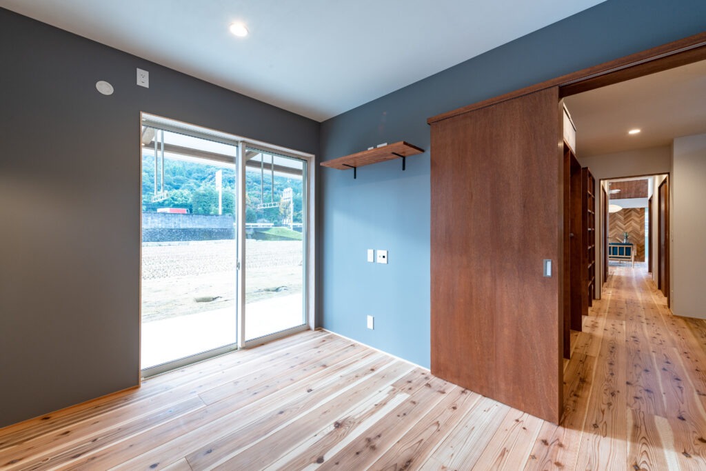 こちらのように、塗りつぶしと組み合わせてガラスや框のあるデザインを楽しむのも素敵です。色付きの室内ドアにすることで壁面にワンポイントができ、メリハリのある空間コーディネートが完成しました。